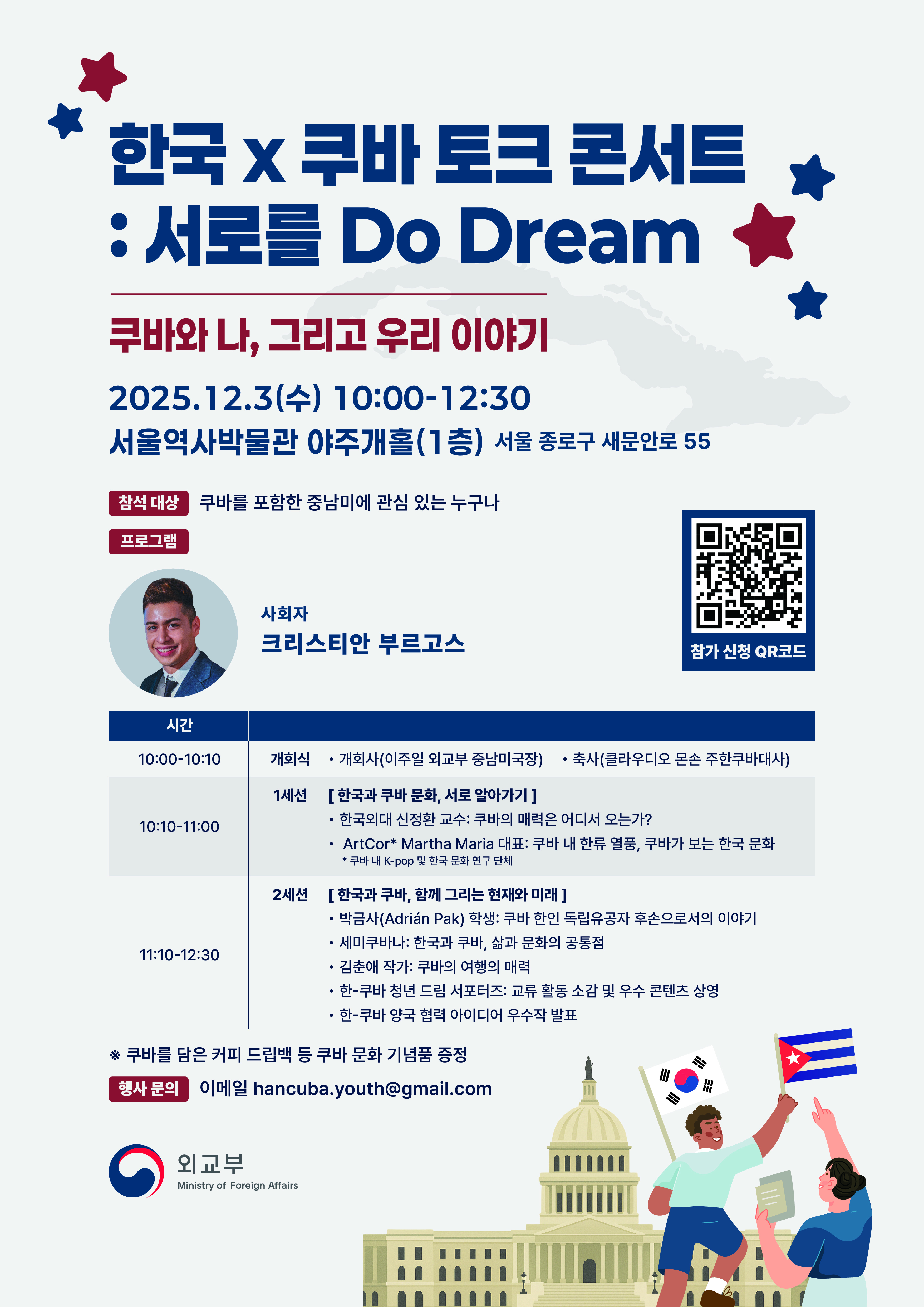 한-쿠바 청년교류사업의 일환으로, 다가오는 12월 「한국 x 쿠바 토크콘서트: 서로를 Do Dream」을 진행할 예정입니다.